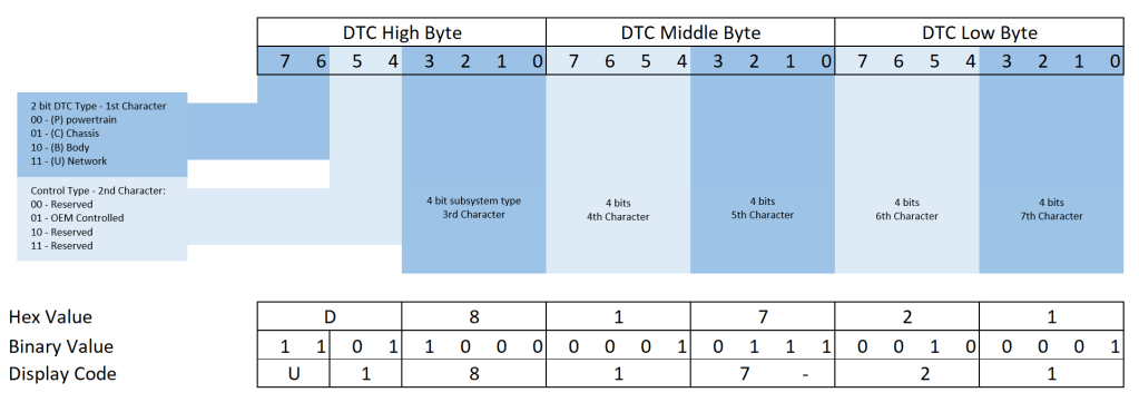 The breakdown of a DTC ID – As engineers we’re concerned mainly with the hex value and what each bit means. However, the display value (what is externally reported to technicians and test tools) isn’t the hex code. In the case of the above, 0xD81721 would be displayed as U1817-21.
