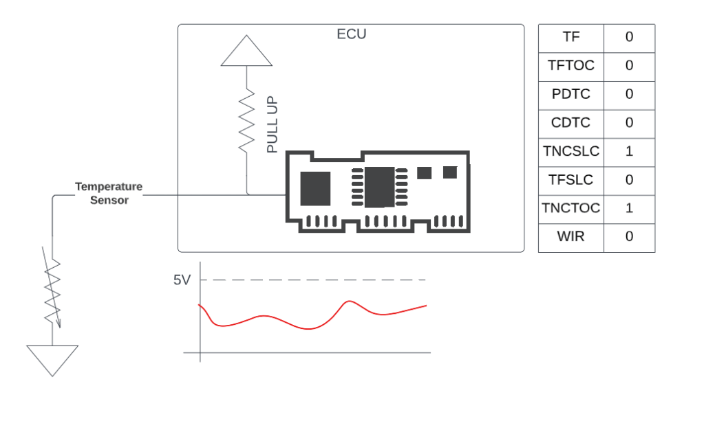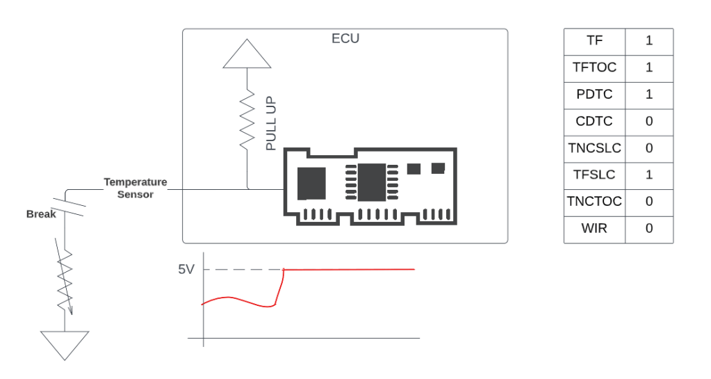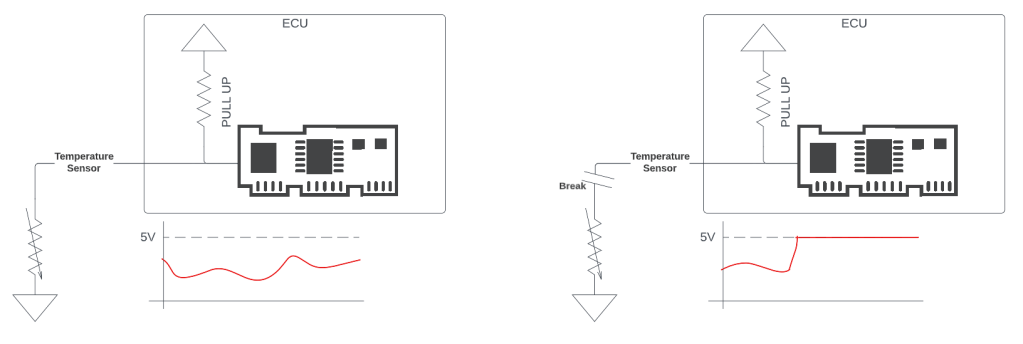 When the sensor is disconnected, the ECU knows because the voltage should be out of the normal range – in our example, reading 5V for a long time means the sensor is no longer connected, and ECU software can report that this diagnostic has failed